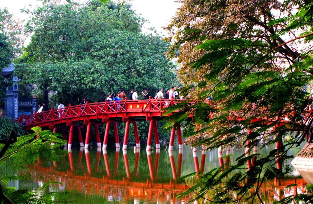 - Cầu Thê Húc: Cây cầu gỗ cong cong, sơn màu đỏ tươi, có kết cấu đặc biệt, cầu dẫn vào Đền Ngọc Sơn thực sự đây là nơi có hàng trăm góc chụp ảnh khác biệt.